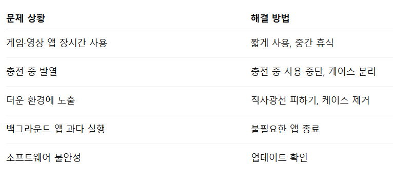 - 고사양 게임, 동영상 스트리밍, 카메라 연속 사용 등은 CPU·GPU에 과부하를 주어 발열을 유발합니다.